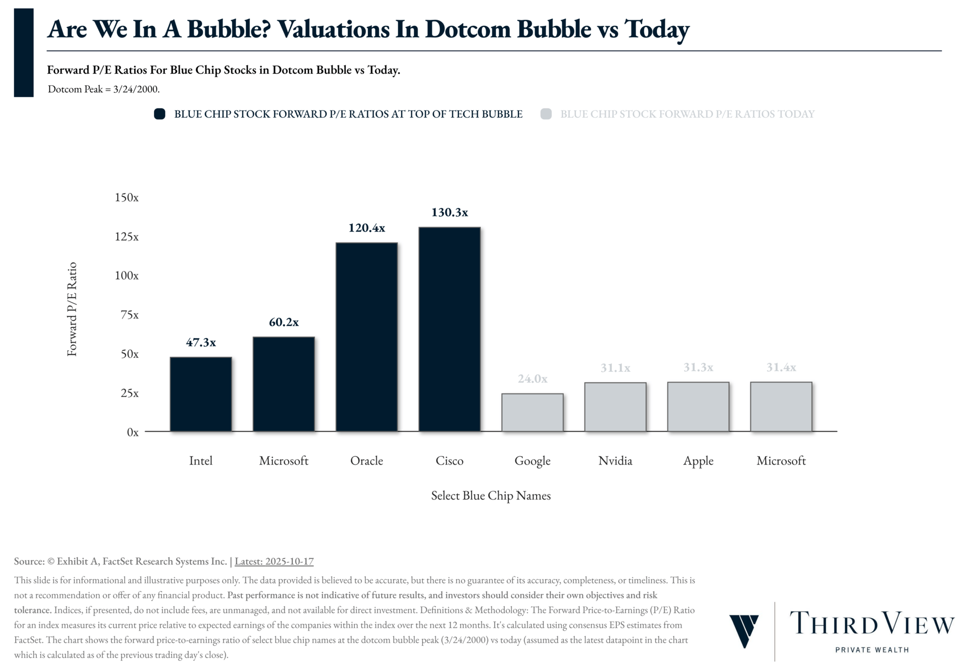 To put things in perspective, it helps to look at how today’s valuations compare to those during the Dotcom era. Take a look at this graphic comparing blue chip valuations then and now: